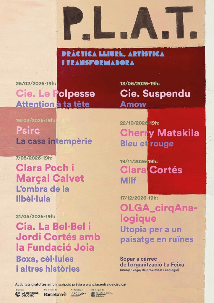 Enguany continuarem amb el format d’obertura de processos iniciat el 2025: el P.L.A.T. (Pràctica Lliure, Artística i Transformadora). Es tracta d’un espai on artistes i companyies en residència poden obrir i compartir el seu procés creatiu o univers artístic amb un públic divers. Aquesta obertura no està limitada al format de mostra work in progress; pot incloure qualsevol classe de material creatiu, proposta escènica, dinàmica o experimentació artística.